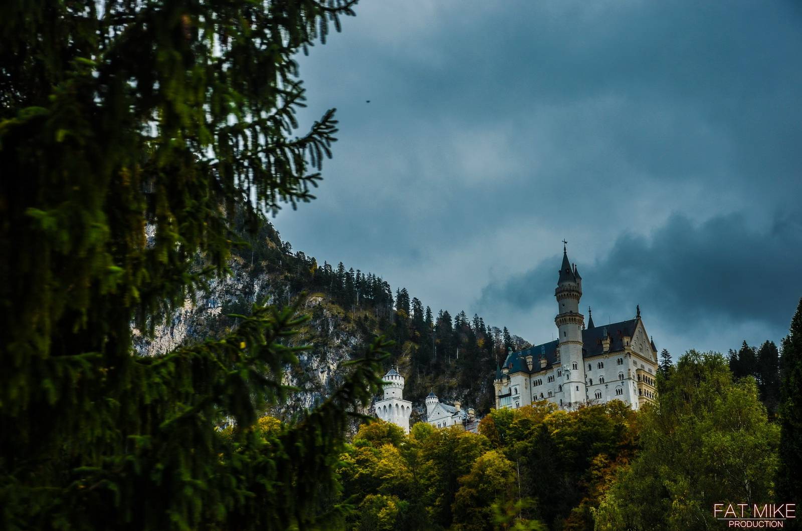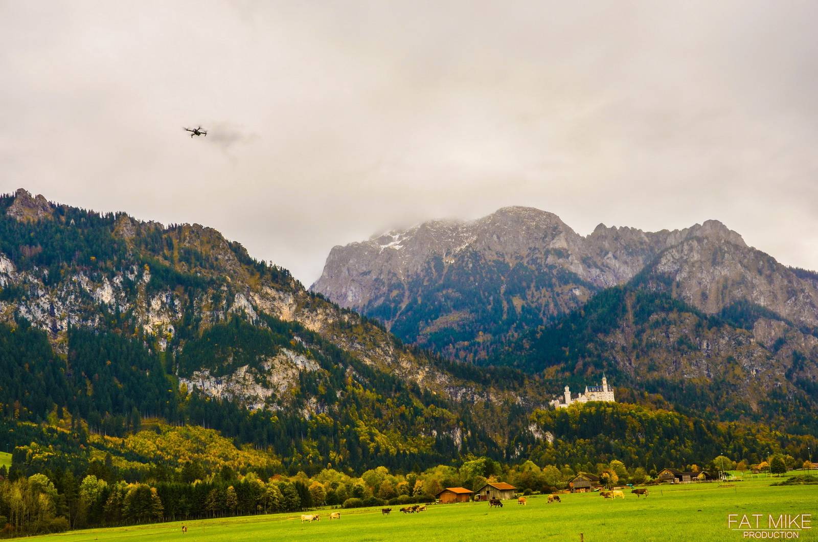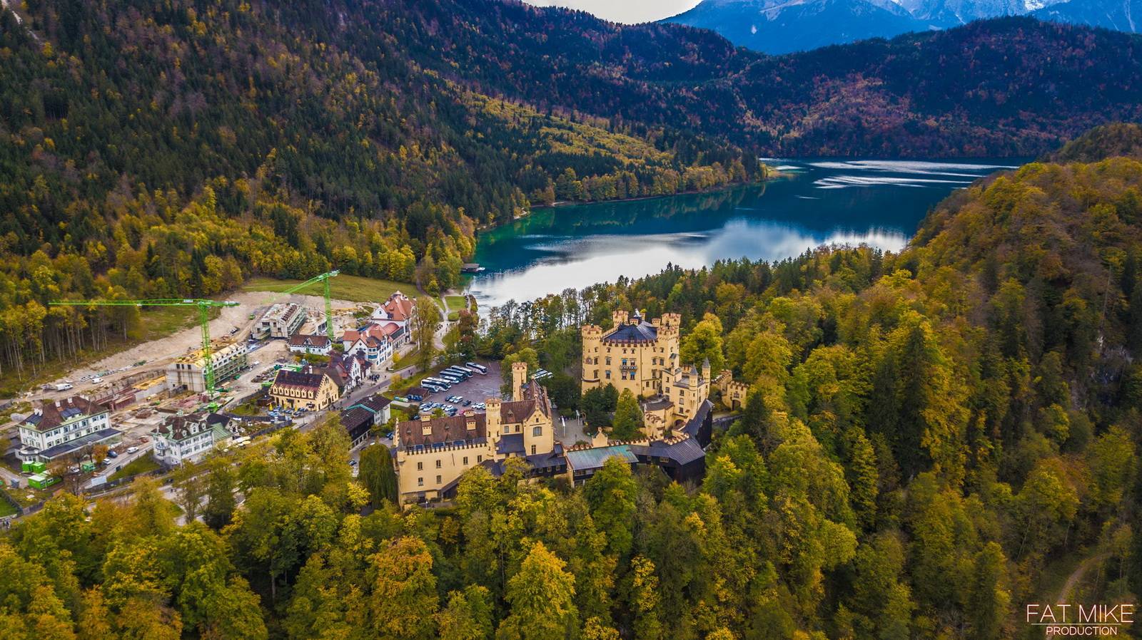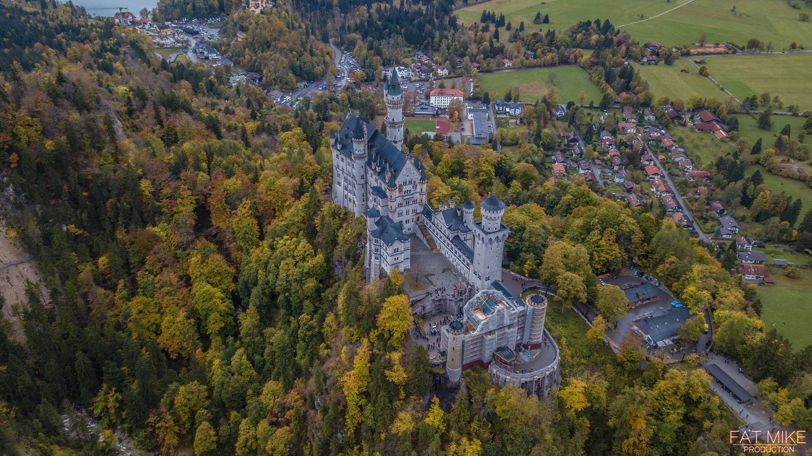 一路驱车,还是会时不时的下雨。到达天鹅堡脚下的时候,雨势渐小,考虑到之前在霍亨索罗的经历,还是担心天鹅堡会禁飞无人机,于是在城堡下的一个观景点停车拍摄。 尽管还有一些小雨,但是好在并没有影响Mavic的飞行和拍摄。也算是留下了迄今为止最长的一段航拍素材。 两座天鹅堡——新天鹅堡和高天鹅堡,距离并不遥远,所以在空中也可以同时照顾一下。