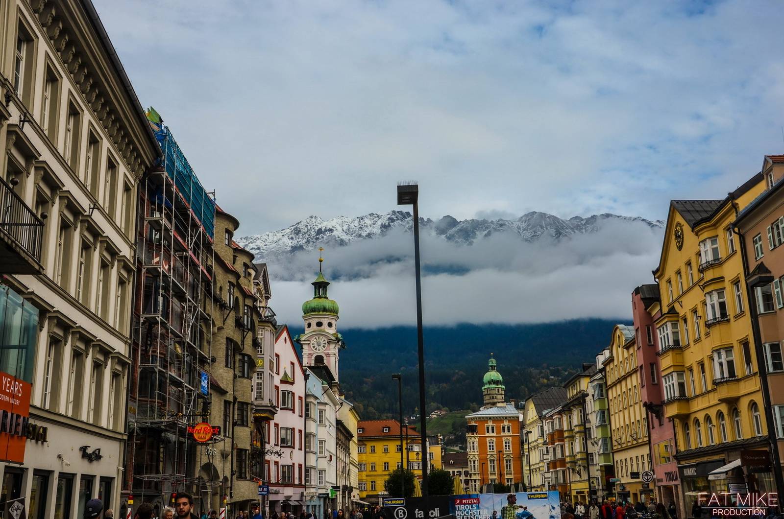 公寓阳台正对着后面的雪山,拍摄延时视频倒是不错。 在因斯布鲁克,步行到老城区也不过5分钟左右,那里有城市塔楼,黄金屋顶等景点。